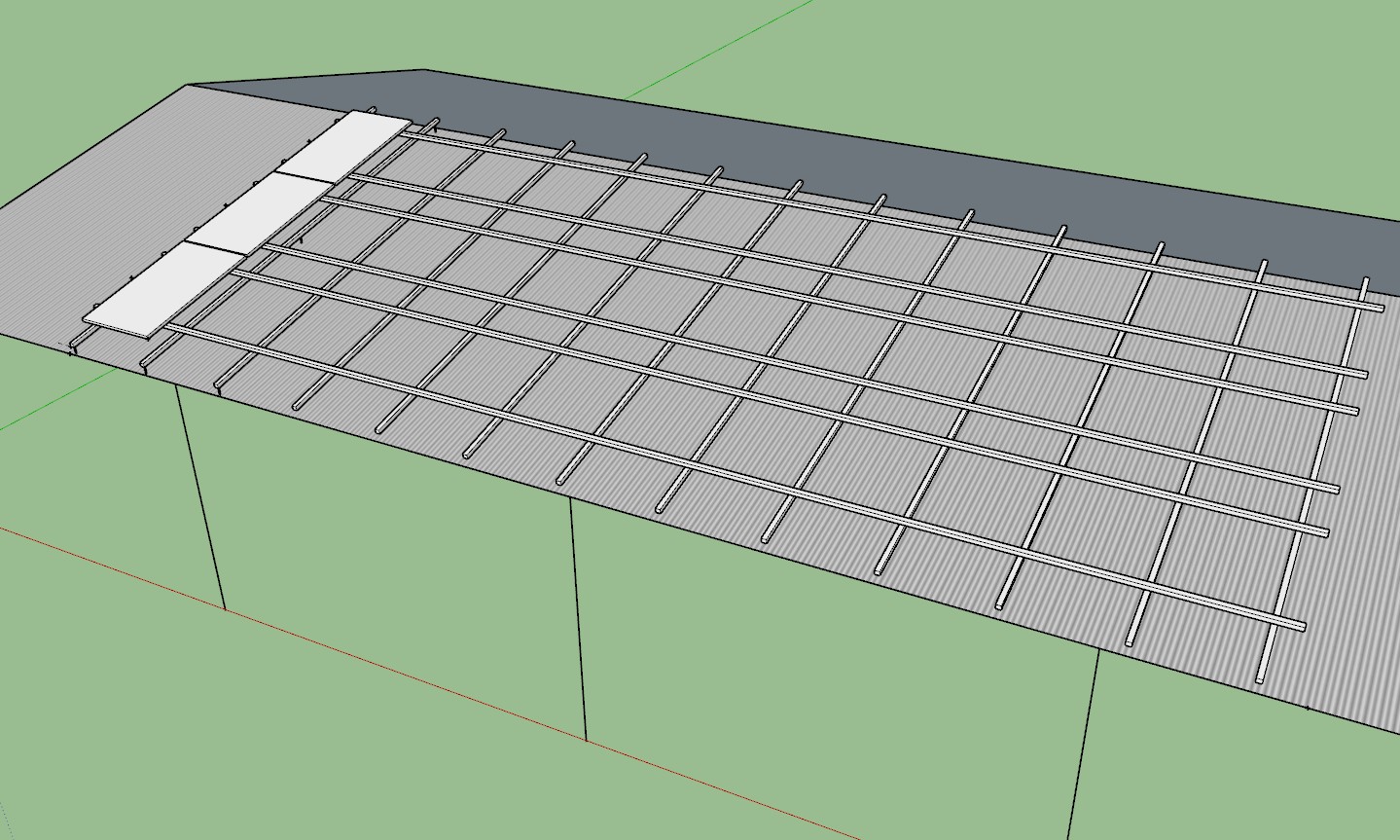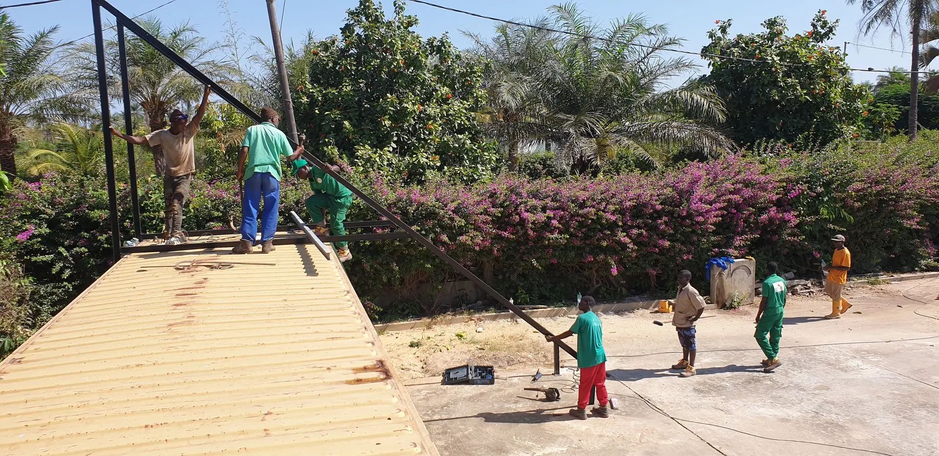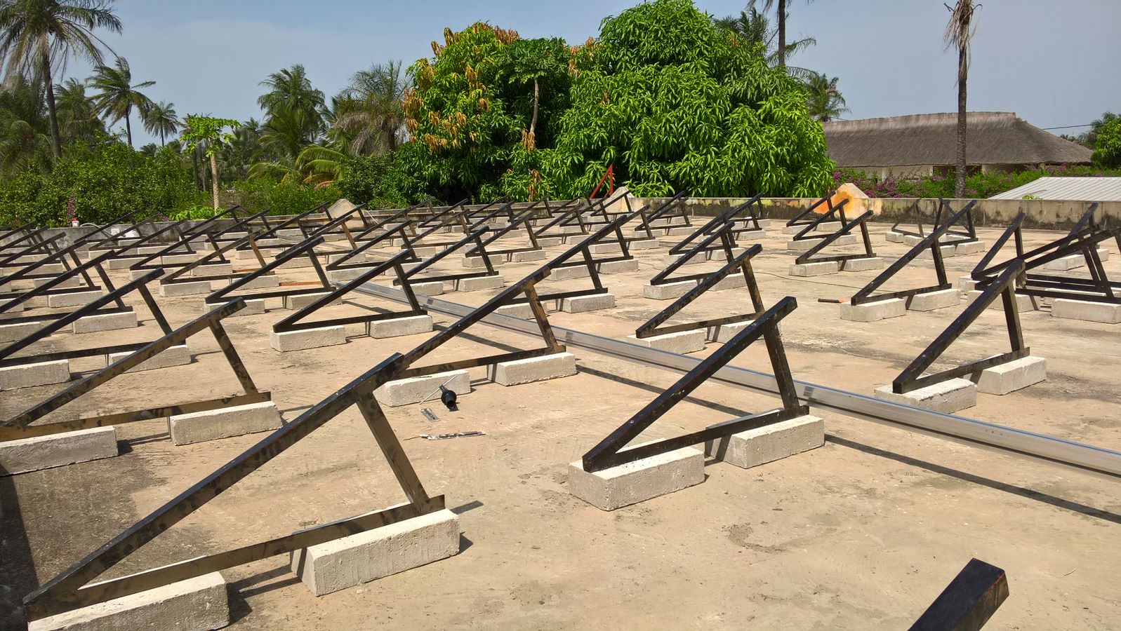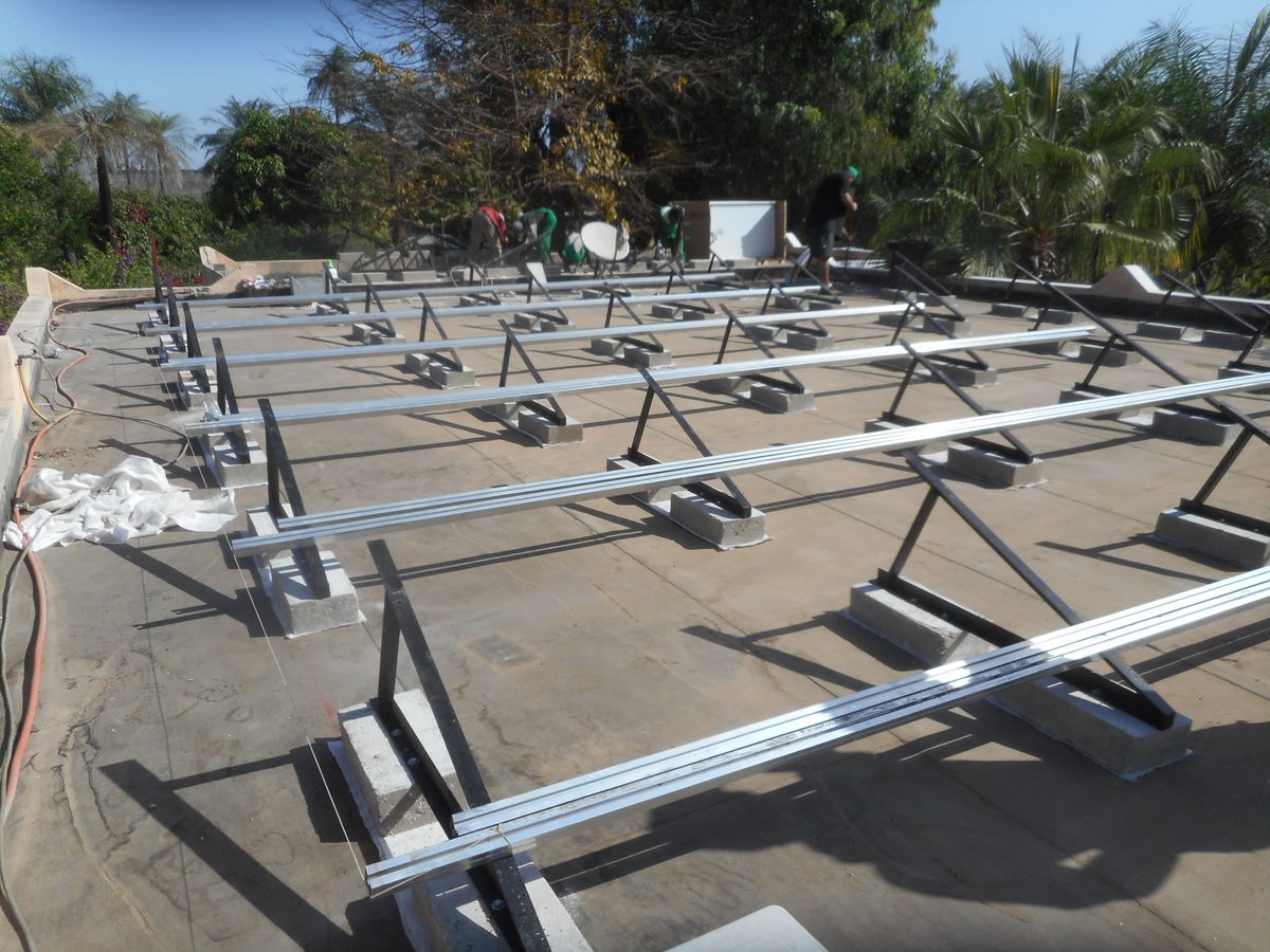 Afin d'équiper les toitures-terrasses de panneaux solaires, des blocs de beton ont été coulés sur place et ont servi de lestage aux structures soudées dans notre atelier. L'inclinaison choisie a été choisie afin d'optimiser le rendement durant la saison sèche, lorsque l'hotel est en pleine acivité.