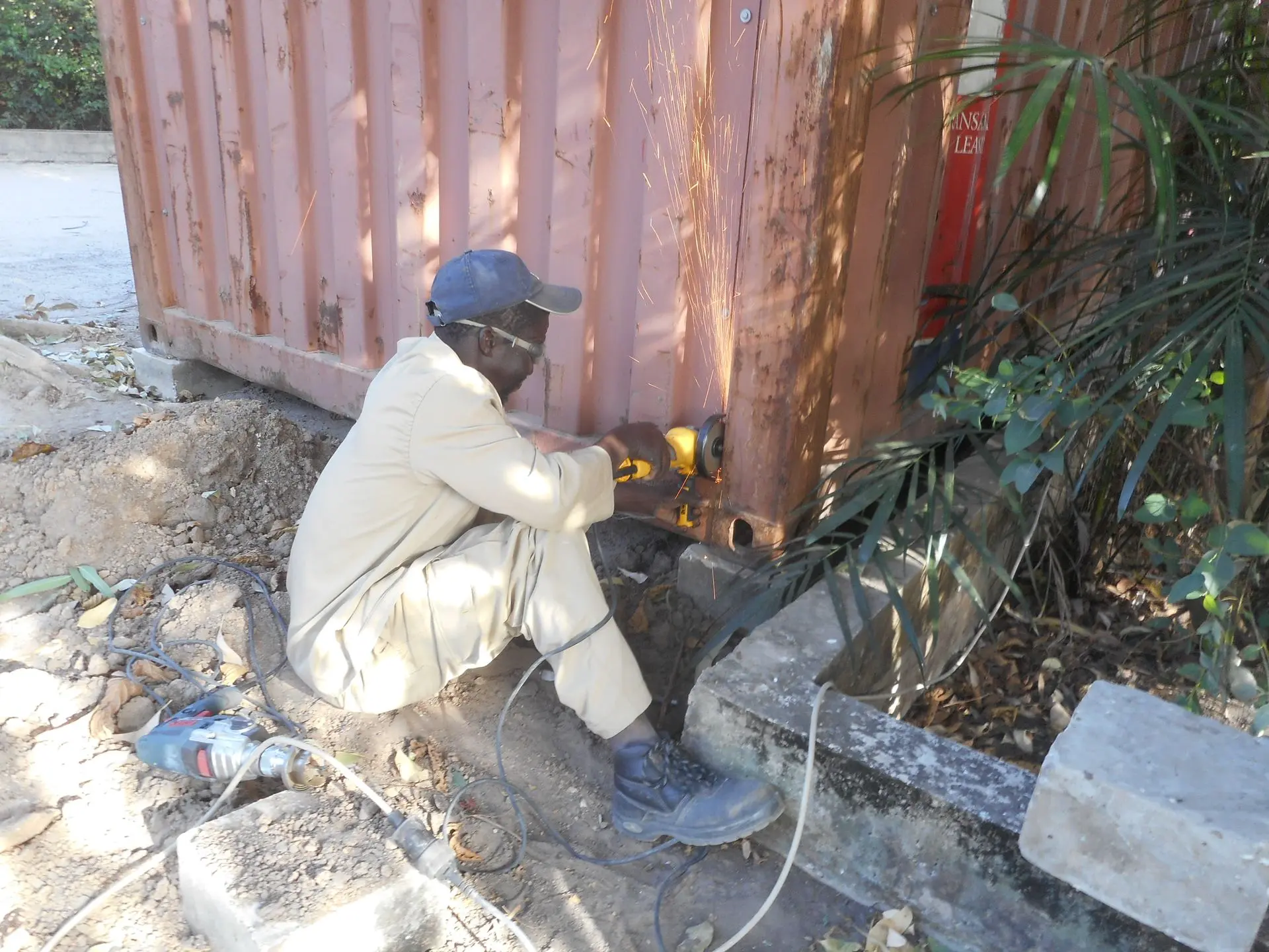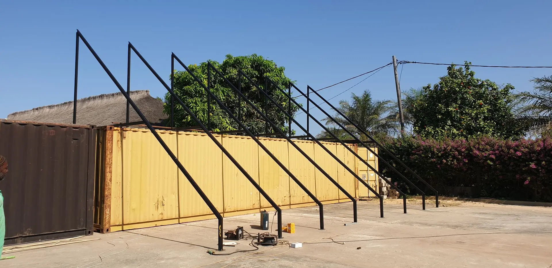 Il a entrepris l’assemblage de ces imposantes armatures métalliques, destinées à être solidement soudées au container, garantissant ainsi une base robuste et durable pour accueillir les panneaux solaires.