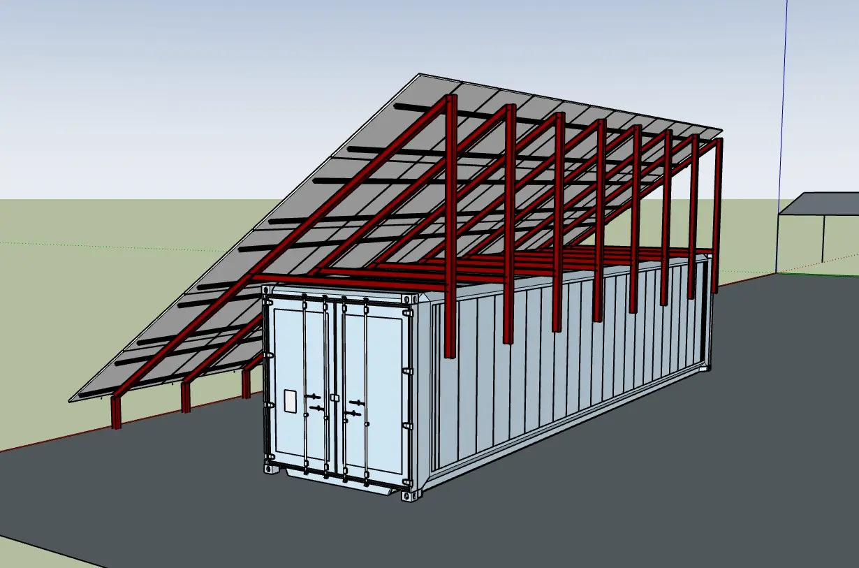 Pour ce deuxième projet, nous avons également choisi d’augmenter la puissance totale du générateur photovoltaïque. Ne disposant plus de toiture disponible, nous avons eu l’idée d’utiliser le container de transport des panneaux comme structure porteuse.