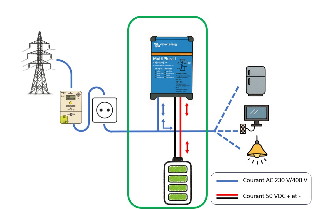 Dès le courant revenu, le réseau alimentera à nouveau l'appareil connecté mais rechargera également la batterie pour la coupure suivante.